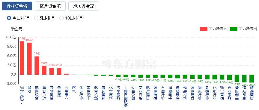 行业资金方面,截至收盘,光学光电子、游戏、电网设备等净流入排名靠前,其中光学光电子净流入10.73亿。