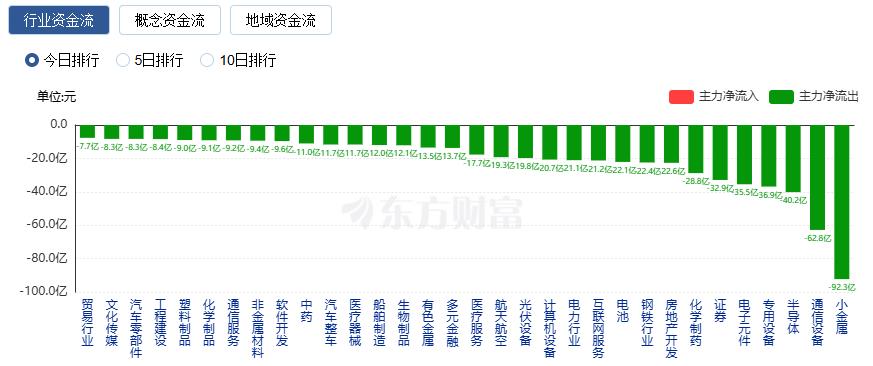 净流出方面,小金属、通信设备、半导体等净流出排名靠前,其中小金属净流出92.28亿元。
