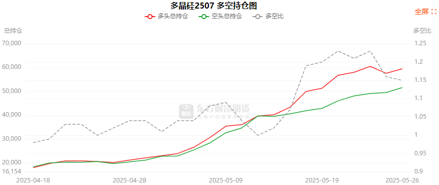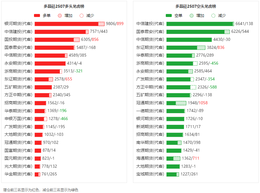 总体而言,多晶硅2507合约今日增仓下行,多空持仓排名前20席中,多空双方均呈进场态势,多头进场意愿弱于空头。