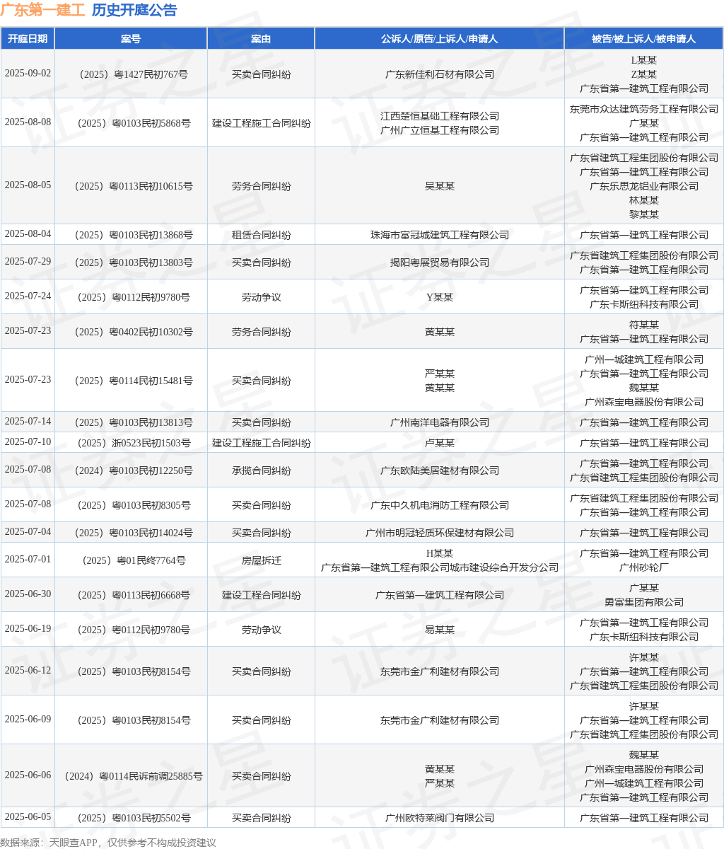案号:(2025)粤0113民初10615号审理法院:广州市番禺区人民法院案由:劳务合同纠纷当事人信息: 原告/上诉人:吴某某 被告/被上诉人:广东省建筑工程集团股份有限公司、广东省第一建筑工程有限公司、广东乐思龙铝业有限公司、林某某、黎某某开庭日期:2025年8月5日根据统计,近一年内以广东省第一建筑工程有限公司为当事人的历史开庭公告有155则,其中案由为“买卖合同纠纷”的公告以79则居首,其次为“建设工程施工合同纠纷”有14则,“建筑设备租赁合同纠纷”有12则。历史开庭公告(前20条)如下: