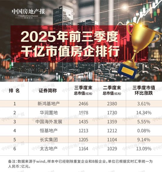 三季度,市值超过千亿元的上市房企有新鸿基地产、华润置地、中国海外发展、恒基地产、长实集团和太古地产6家,数量上与二季度持平。这其中,港资房企占比较高,新鸿基地产仍然是市值最高、也是唯一一家市值超2000亿元的房企,三季度末的总市值达到2466亿元,环比二季度上涨3.61%。
