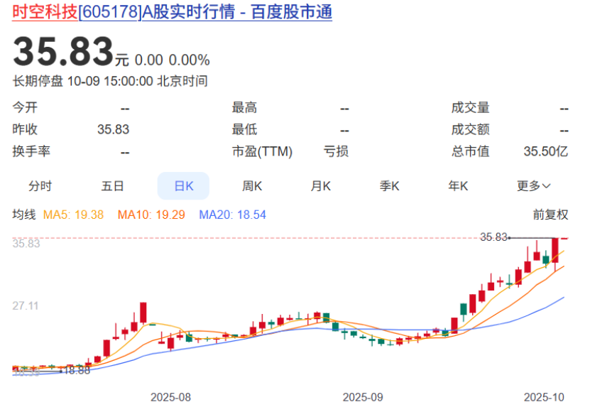 从市场表现来看,在停牌前的最后一个交易日,即9月30日,时空科技股价收获涨停,收盘价为35.83元/股,对应公司总市值为35.5亿元。
