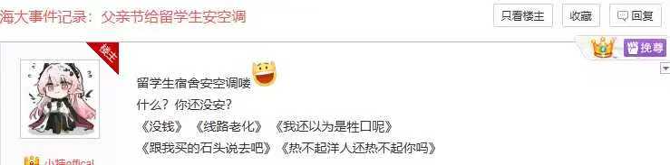 明明中国学生的公寓和留学生公寓是一起建造的,却找各种理由不给安装空调,说什么电路改造,那留学生宿舍一开始安装空调的电路就想好了做好了?也就是从开始就没打算给中国学生宿舍安装空调。