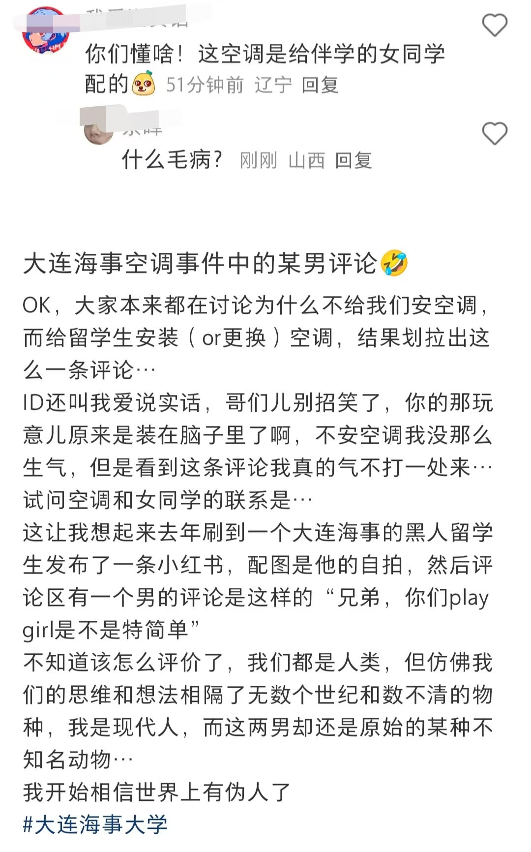 近日有IP为大连海事大学的网友在社交平台发文称,这所高校为留学生宿舍统一更换并安装良心空调,而中国学生宿舍却“连旧空调都没有”。